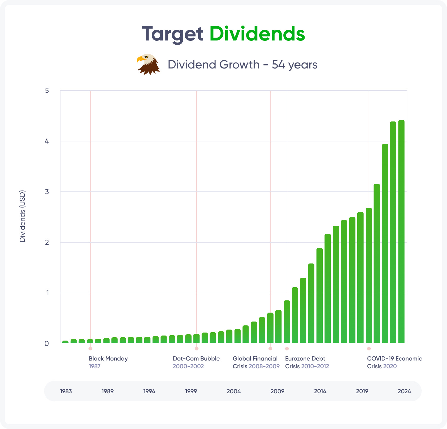 Target Corporation (TGT) has proven itself as a dividend aristocrat, with an impressive track record of paying dividends for 54 consecutive years. The company has consistently increased its dividend payout, with a 5-year CAGR of 11.30% and a 10-year CAGR of 8.86%. The forward annual dividend yield stands at 4.50%, with a forward annual dividend of $4.48 per share.