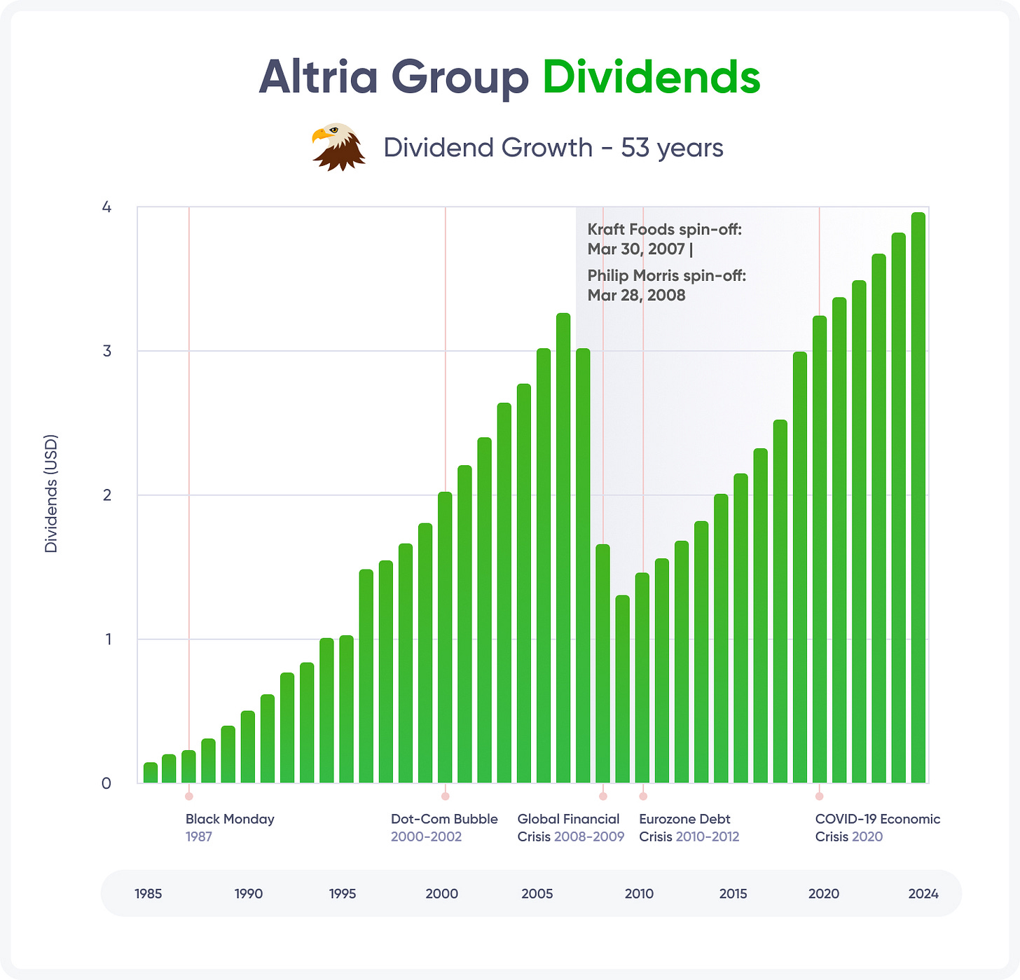 Between 2006 and 2008, Altria executed two spin-offs, distributing shares of Kraft’s and Philip Morris. There was no actual reduction in dividends.