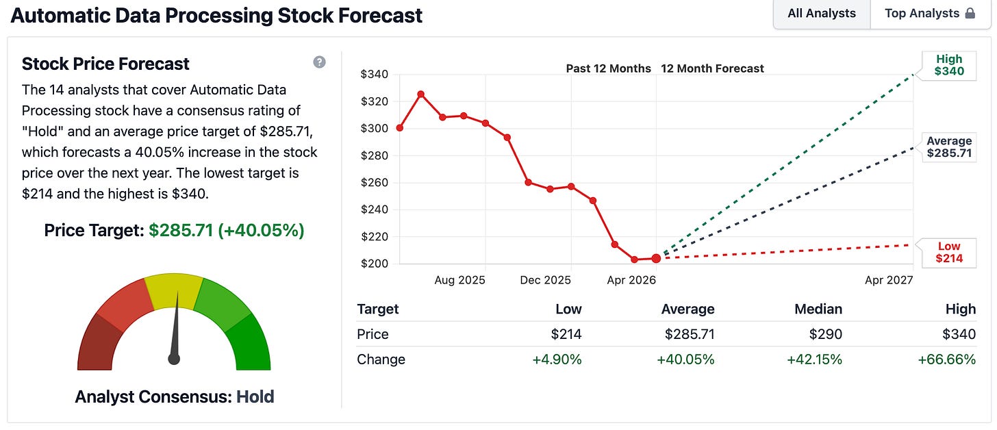 The average 12-month price target is $285.71, implying a potential upside of about 40% from the current levels. Forecasts vary, with the lowest target at $214 and the highest at $340, indicating a wide range of opinions on growth potential. While upside is supported by ADP’s recurring revenue model and technology investments, some analysts remain cautious due to recent stock volatility and broader market conditions