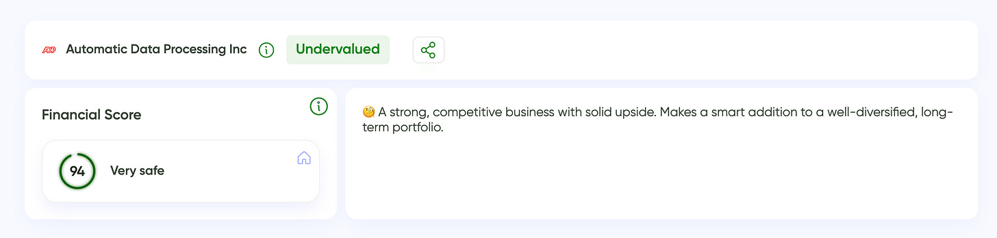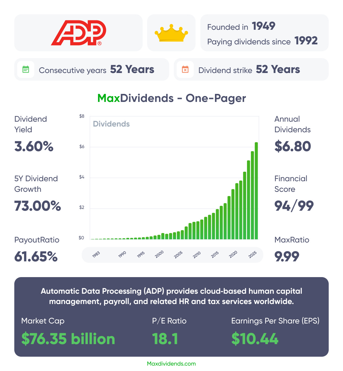 📱 In the MaxDividends app, this financial snapshot illustrates why ADP is often considered a “steady compounder”: a business with resilient demand, solid profitability, and the financial strength to support decades of continuous dividend growth.