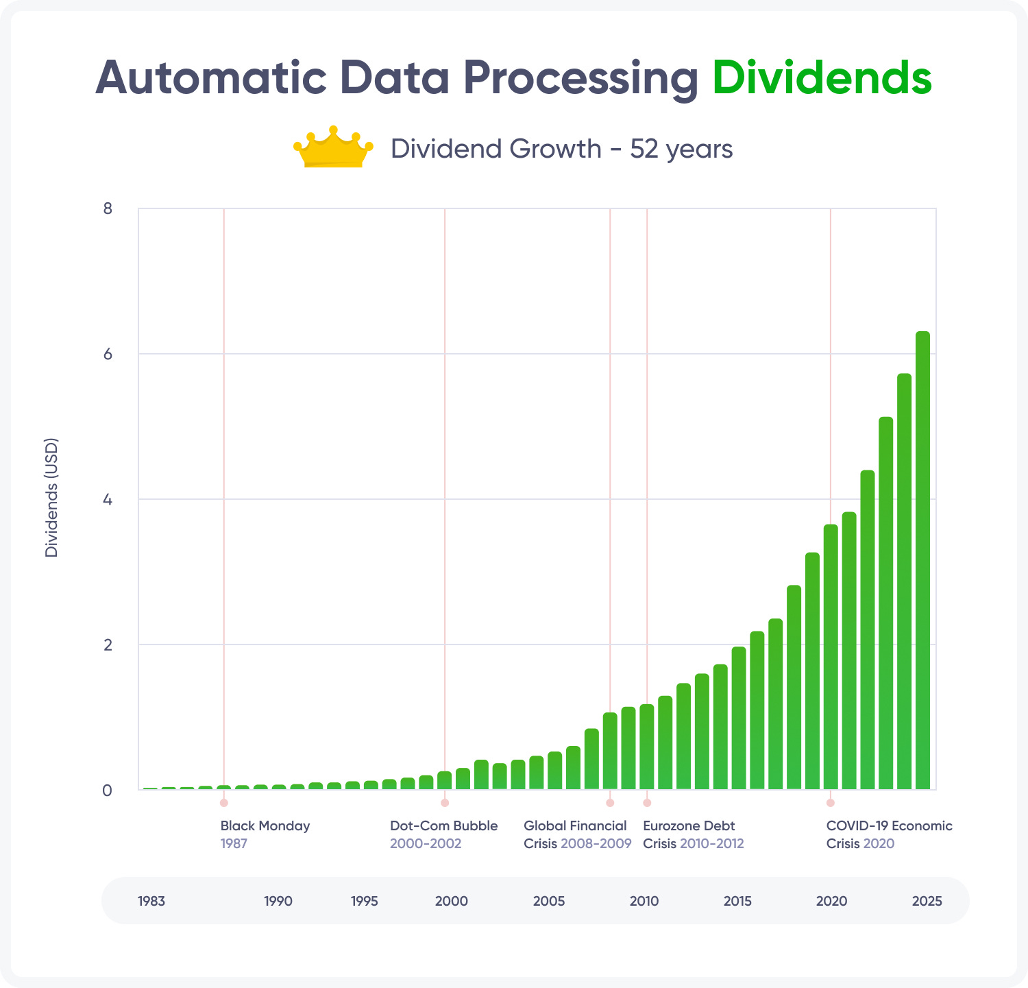 Automatic Data Processing, Inc. (ADP) is a long-standing Dividend Aristocrat with 51 consecutive years of dividend increases. The company has been paying dividends since 1974 and has built a reputation for steady, predictable growth of shareholder payouts.