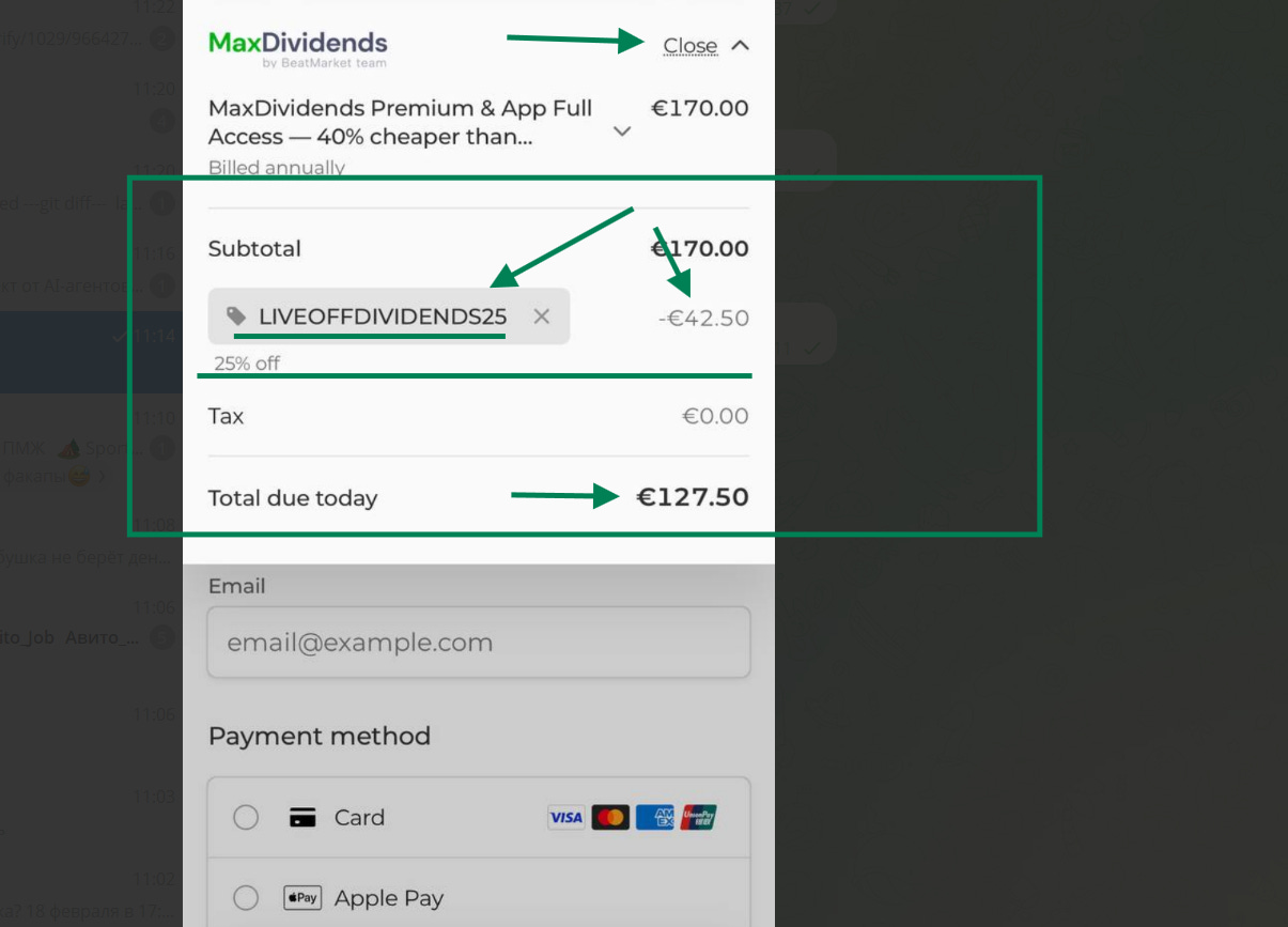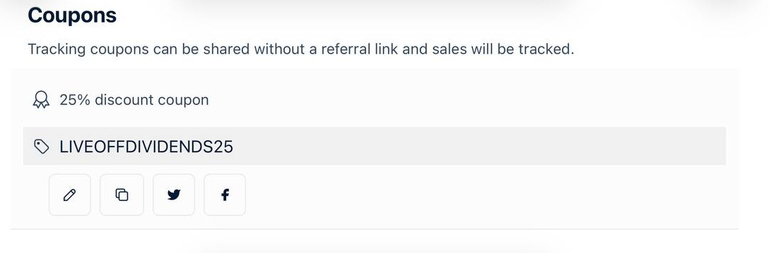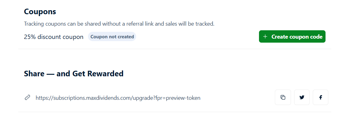 You share your link and provide your custom coupon code. When someone signs up for MaxDividends Premium using your link and coupon, they receive a 25% lifetime discount on their subscription — and you earn your reward according to the Partner Program terms.