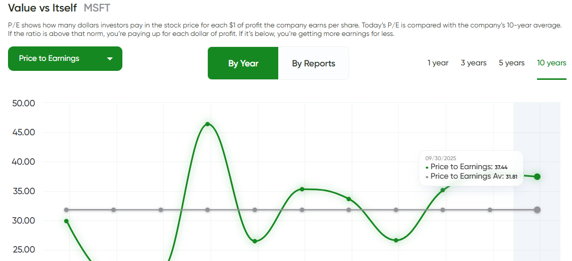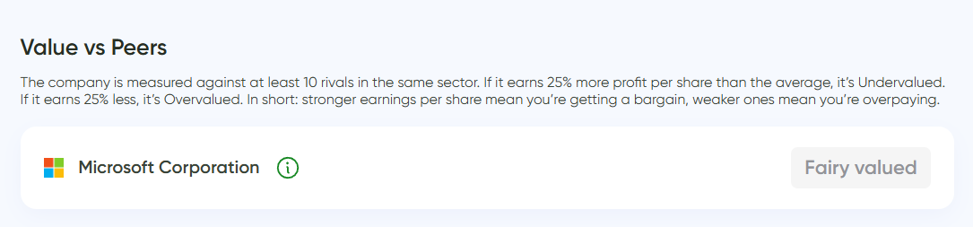 Microsoft shows up as “Fairly valued.” In plain English: it’s priced about right compared to competitors. You’re not getting a bargain, but you’re not badly overpaying either — you’re paying a fair price for a strong, reliable business.