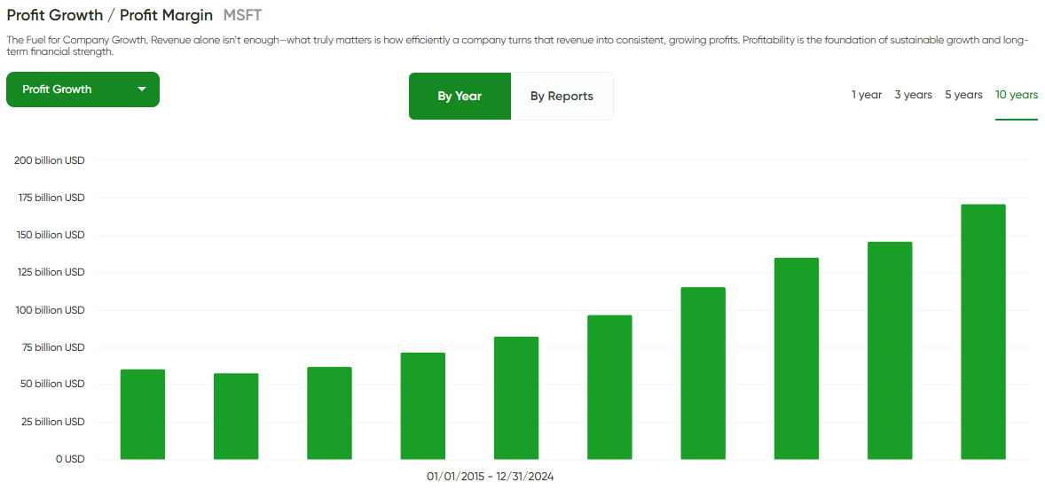 Profits have kept pace with sales. Operating profit grew past $150B in 2024, with margins holding steady thanks to the high-moat software model. Microsoft isn’t just selling more — it’s keeping profits healthy along the way.