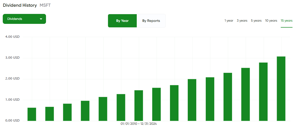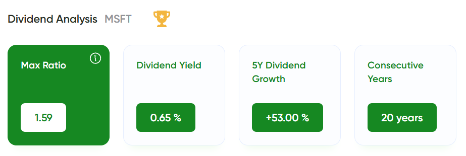 ✅ Step 1 passed — Microsoft clears this bar with ease: 20 straight years of dividend hikes. Microsoft’s dividend history proves consistency, reliability, and a clear commitment to shareholders.