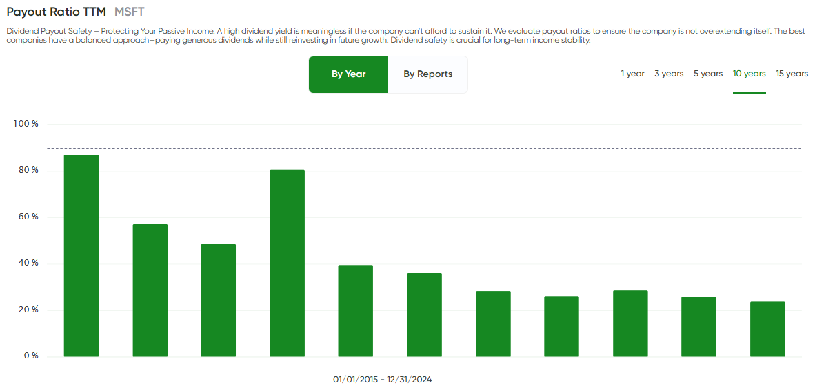 I don’t need the cash flow immediately, but within the next 5–10 years I plan to stop reinvesting and start living off the dividends. For that mission, Microsoft doesn’t make the cut. Capital growth isn’t my top priority anymore — dividend yield and long-term dividend growth are.