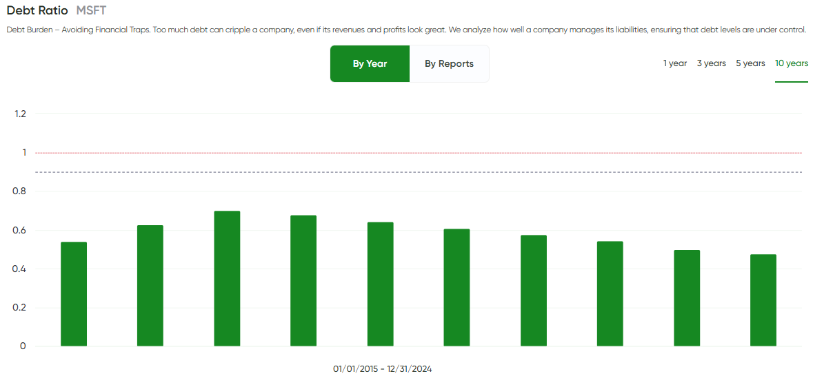 Debt ratio has stayed below 0.7 for a decade, backed by massive free cash flow. Microsoft carries some debt but it’s tiny relative to its balance sheet and cash generation. No red flags here.