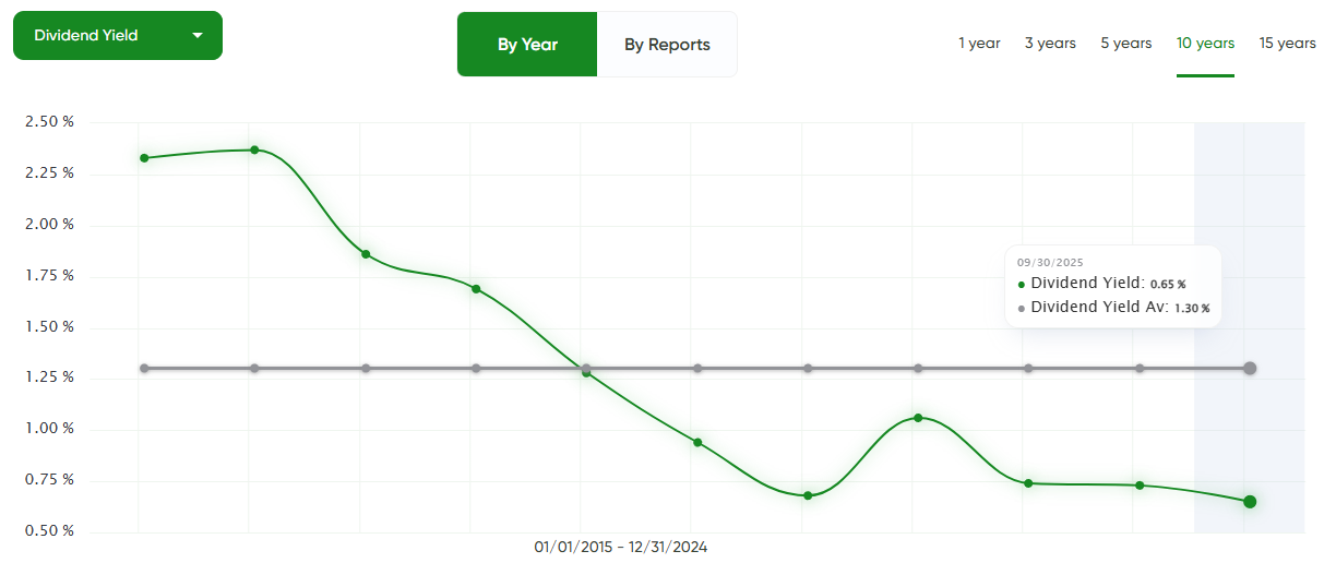 The company has paid dividends since 2003 and raised them every single year. Over the past decade, the average increase has been in the double digits — and in 2025, management already announced another +10% boost.