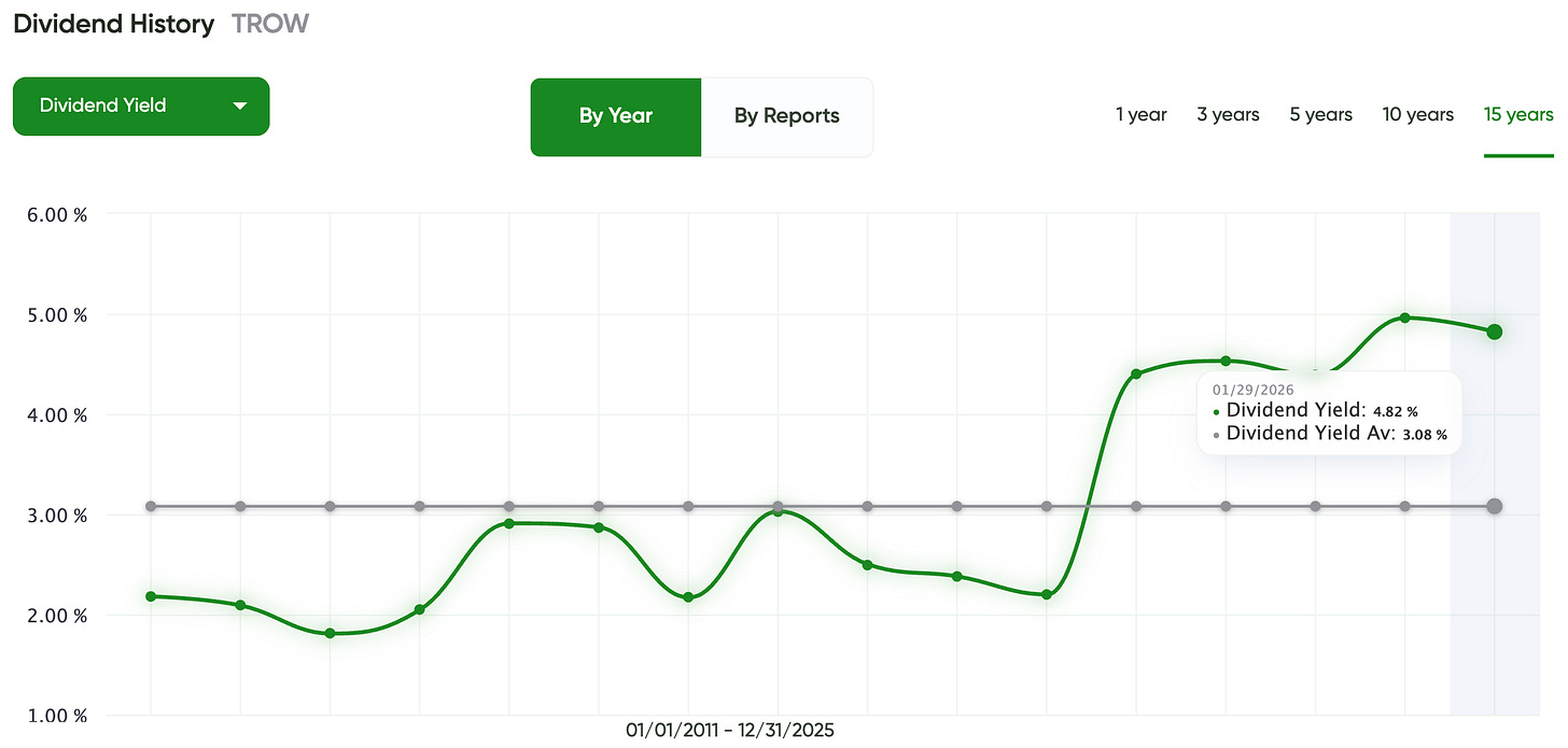 TROW’s current dividend yield is around 4.8%, compared to a long-term average closer to 3.1%. The chart shows that yields at this level have historically appeared during periods of market stress or pessimism — not during normal conditions.