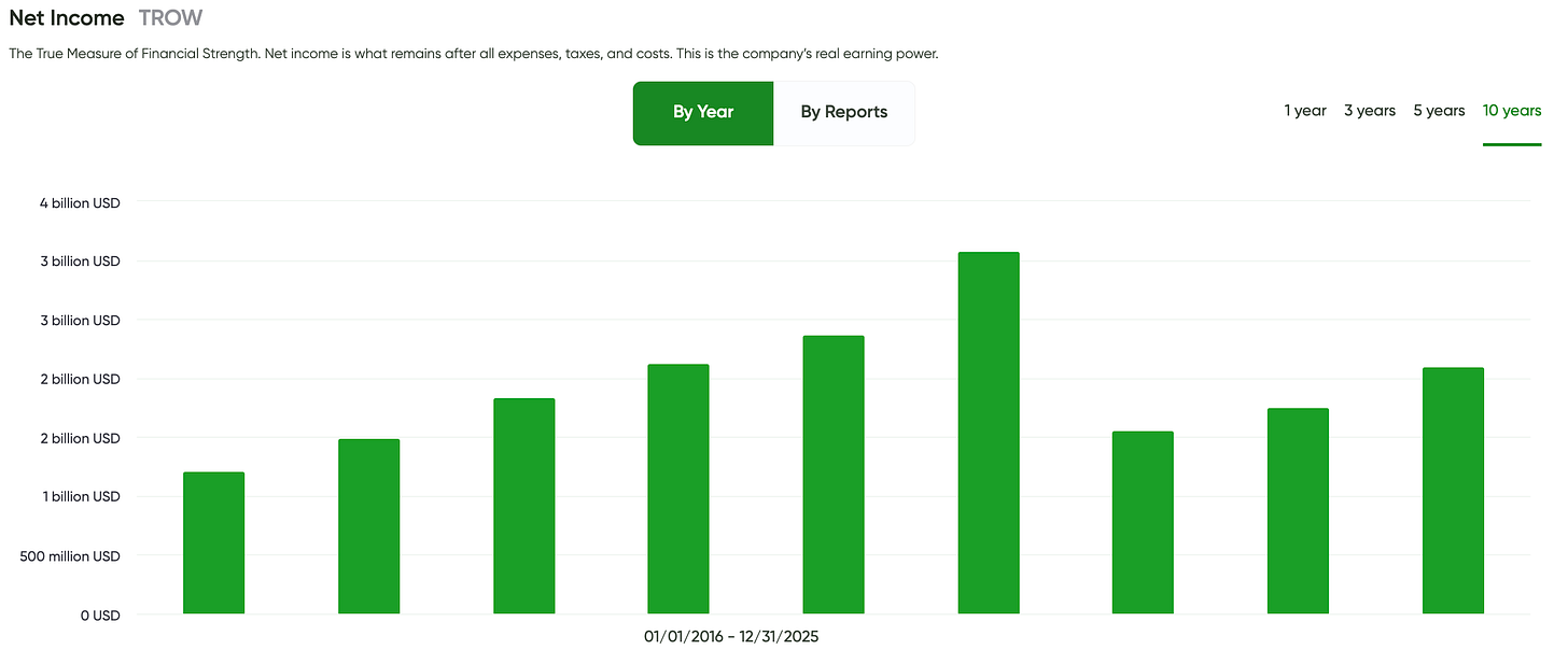 By our Five-Pillar Formula, T. Rowe Price screens as a top-tier dividend business: solid long-term revenue generation tied to asset management fees, strong and consistently high profitability, healthy net income across cycles, a well-covered and conservative dividend payout, and an exceptionally clean balance sheet with minimal leverage.