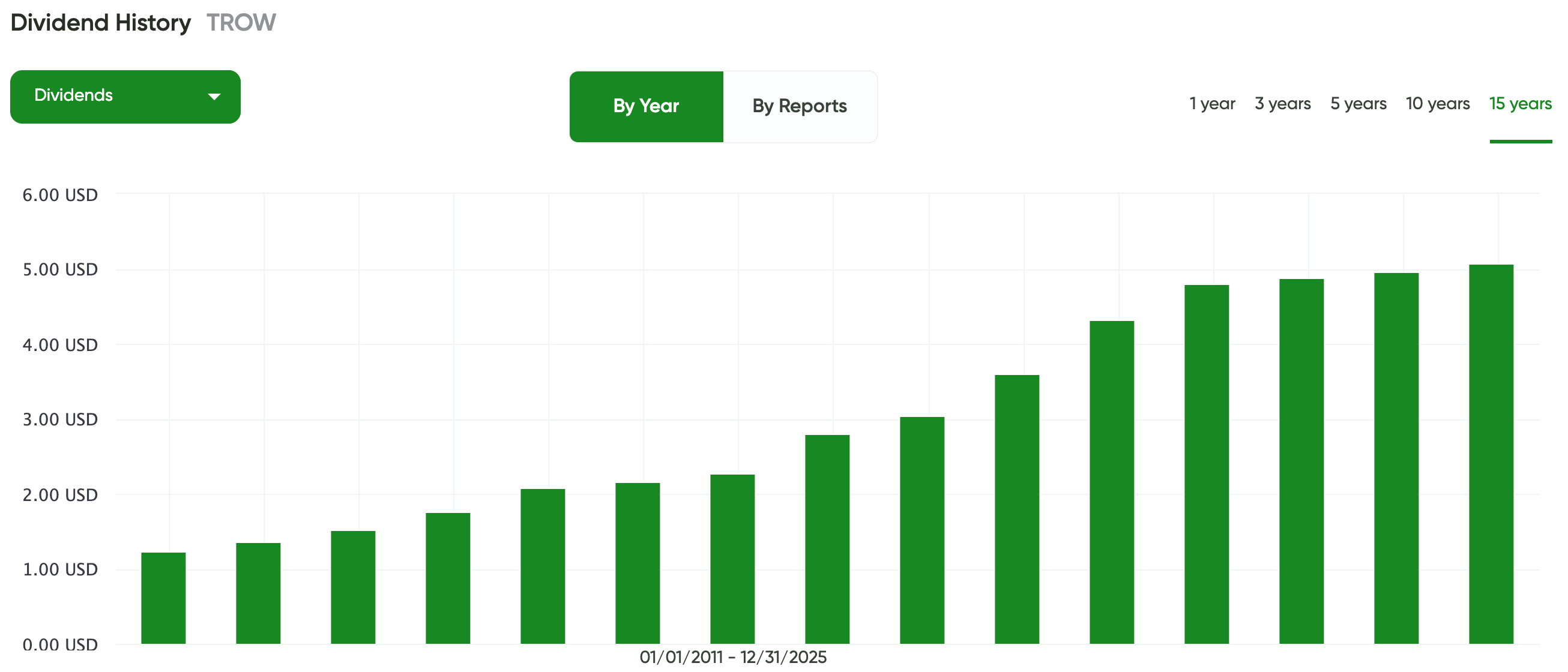 The 15-year dividend chart in the MaxDividends App shows a clear, uninterrupted upward trajectory. Annual dividends rise from roughly $1.20 per share in the early 2010s to $5.00+ per share by 2025.