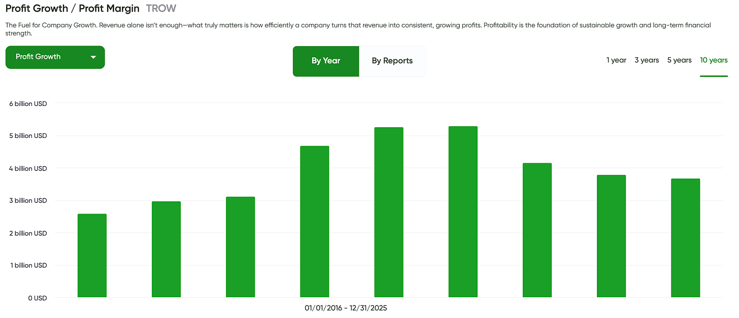 Then came the reset. As markets declined in 2022–2023, TROW’s revenue pulled back sharply into the $6B range, reflecting: