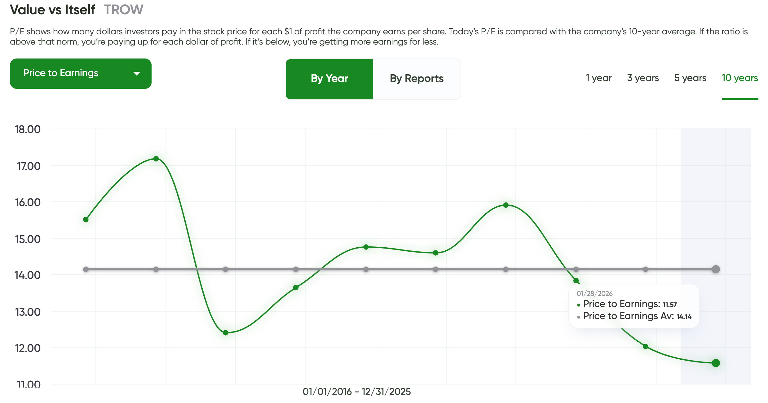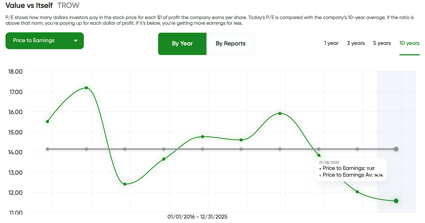 The MaxDividends chart shows that TROW has historically traded at a higher P/E multiple. Today, the stock sits well below its long-term average valuation, which suggests investors are currently paying less per dollar of earnings than usual.