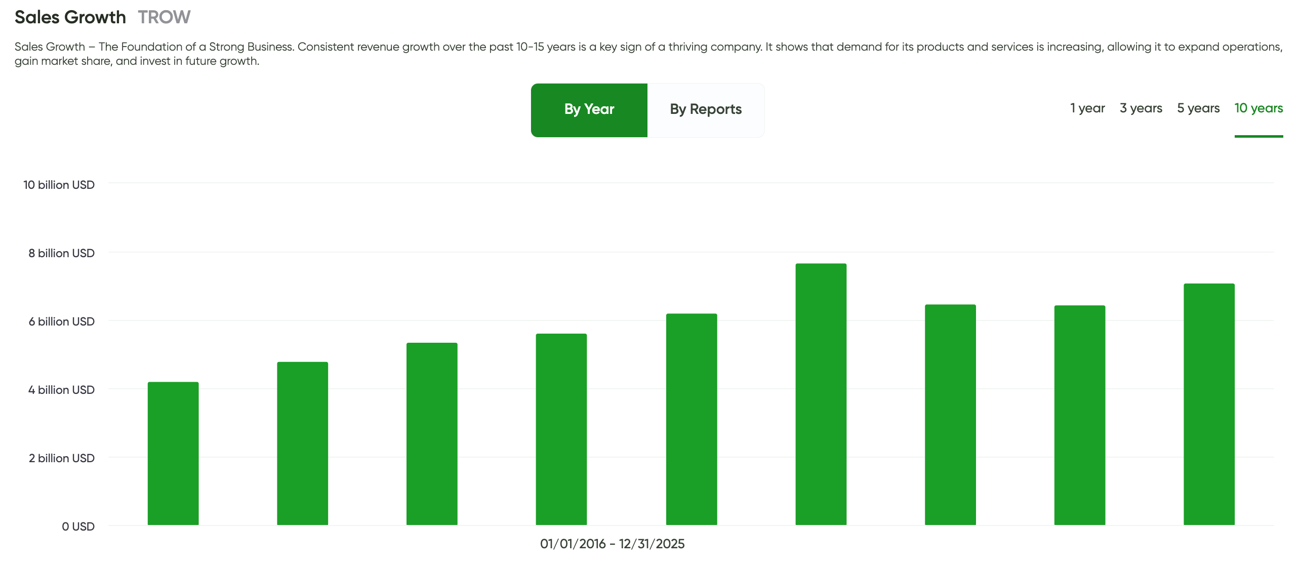 Over the past 10 years, T. Rowe Price’s revenue has been clearly cyclical, moving in line with financial markets rather than following a smooth upward trend.