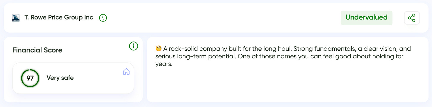 In the MaxDividends App, head to Company Analytics and place the Financial Score next to MaxRatio. That’s where TROW’s role becomes very clear.