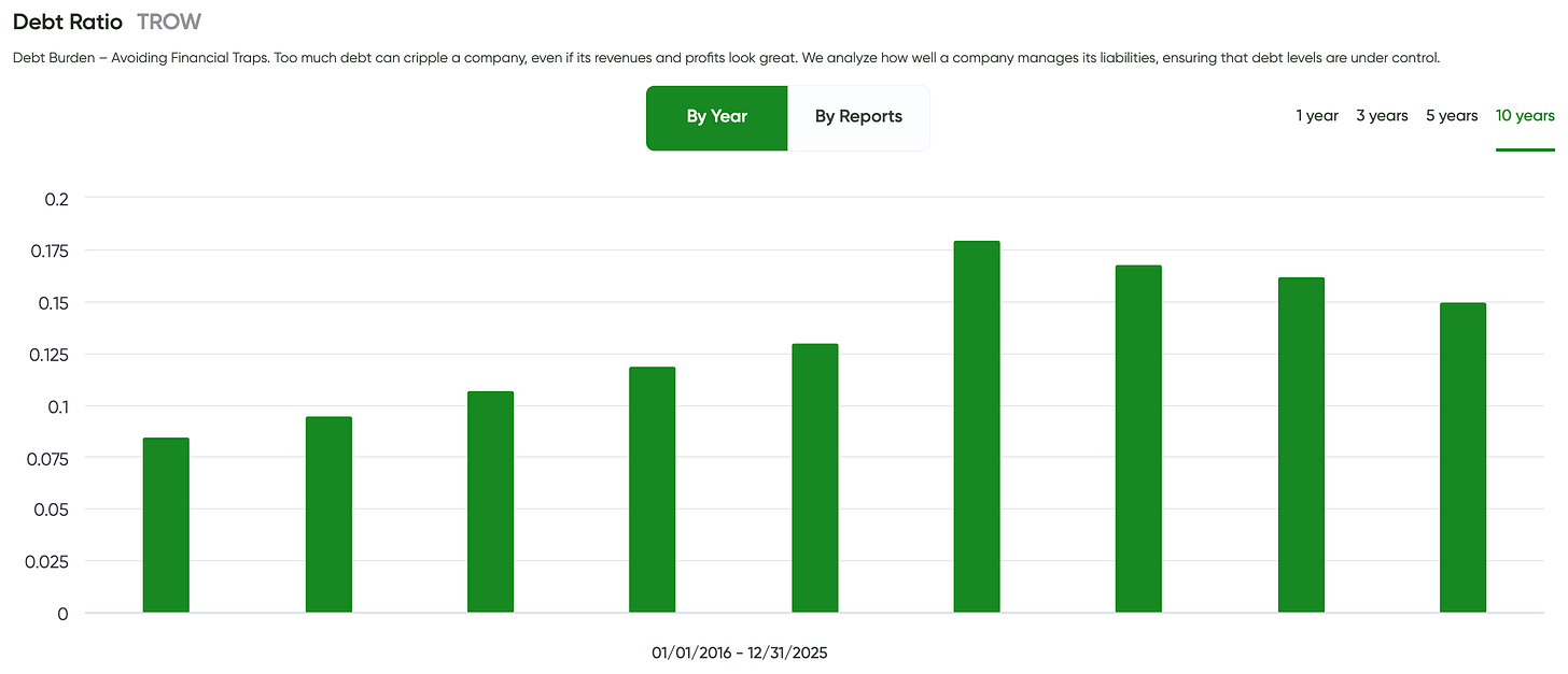 ✅ Debt Burden Passed — T. Rowe Price maintains a conservative balance sheet with minimal leverage, no structural risk, and ample flexibility to support dividends across full market cycles.