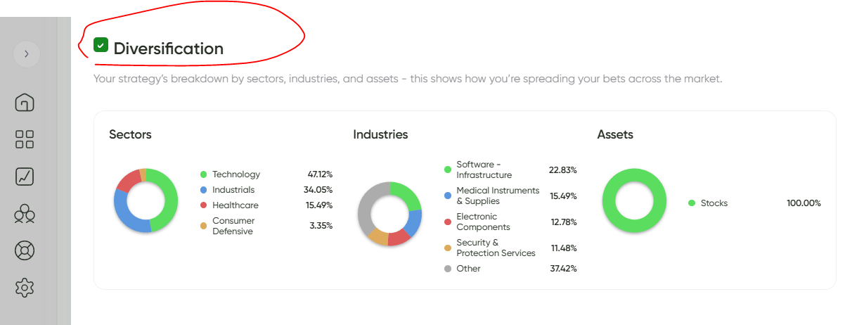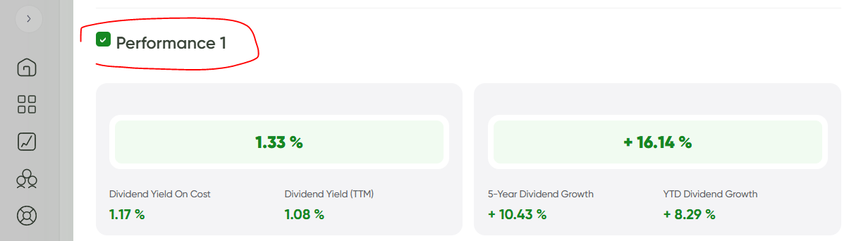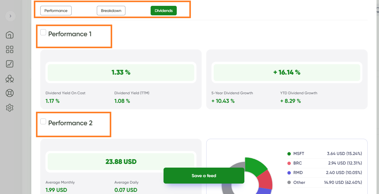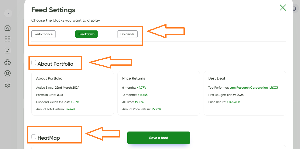 Inside, you’ll see three tabs, each with different portfolio analytics blocks. Next to every block is a simple checkbox. This is where the philosophy of MaxDividends really shows up.