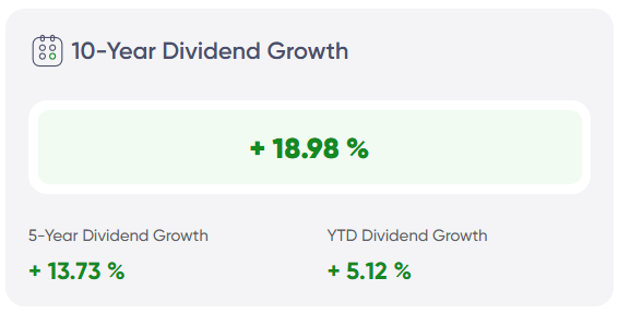 Example: 10 years ago, $5/year → today $15/year = +300% total, ≈ +12% per year.5Y Annual Dividend Growth: Same as above but for the past 5 years.