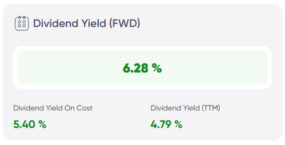 Example: Invested $100 three years ago, stock paid $5/year back then → Yield on Cost was 5%. Now it pays $10/year → Yield on Cost is 10%.Dividend Yield TTM: The yield you’d get if you bought your current portfolio today at today’s prices.