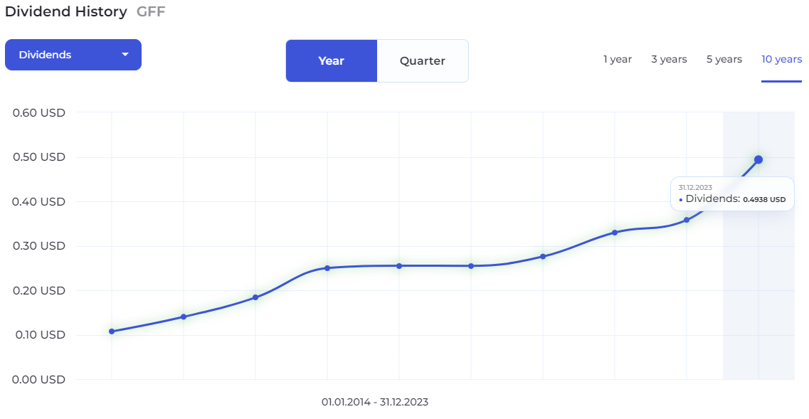 One of Griffon’s standout features is its steady dividend growth, which has averaged 17.91% annually over the last three years. As of September 2024, Griffon pays a quarterly dividend of $0.15 per share, a notable increase from $0.06 per share in 2016.