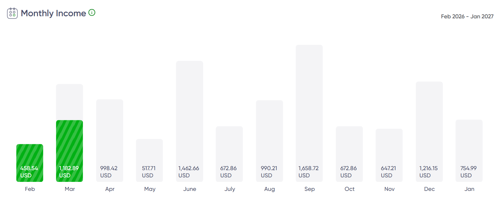 Monthly Income Trend: multiple months now crossing $1,000 — September remains the peak at $1,658.