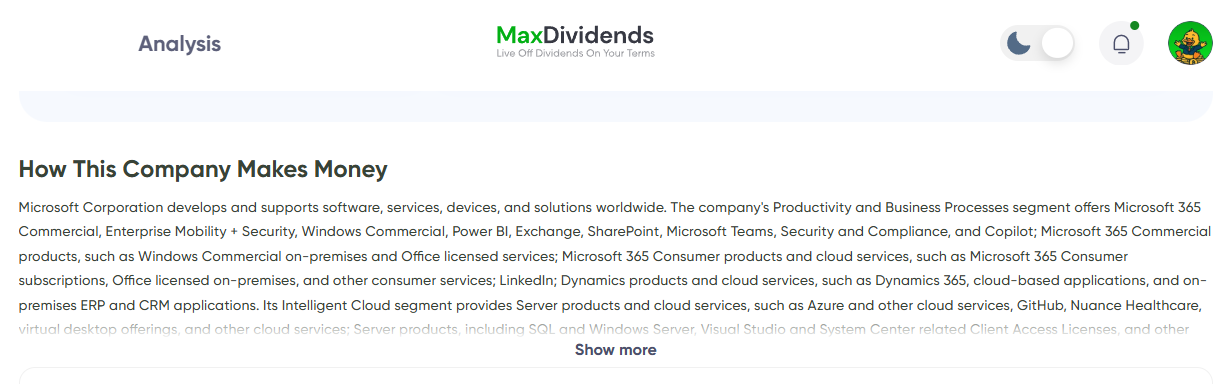 I read the company description inside MaxDividends analytics and focus on how the company makes money, who pays them, why customers stay, and where the cash flow really comes from. If that explanation makes sense to me, I move forward.