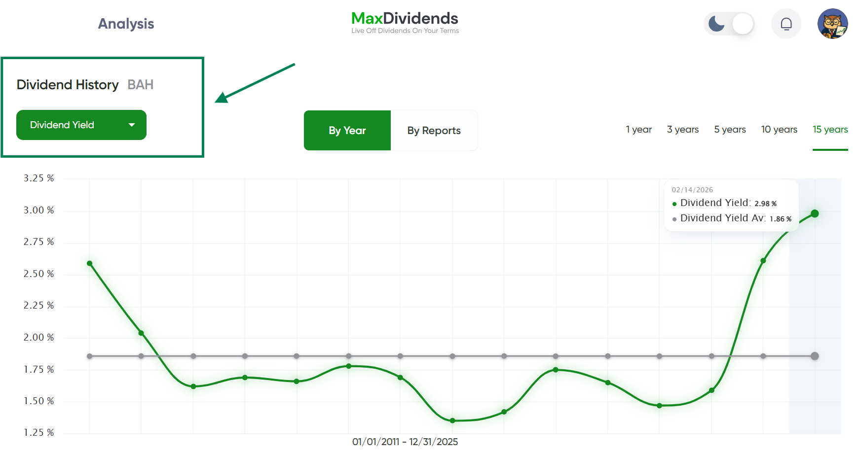 MaxRatio is an estimated dividend yield on cost calculated by combining the current dividend yield with the 5-year & 10-year average dividend growth rate, projected over the next 10 years. It provides a clear outlook on future dividend returns.