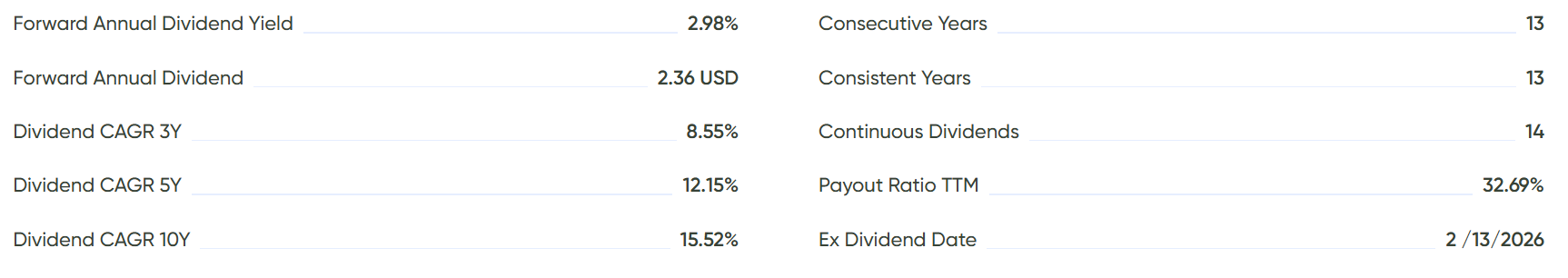 With a payout ratio near one-third of earnings, the dividend is supported by underlying profitability rather than financial leverage.