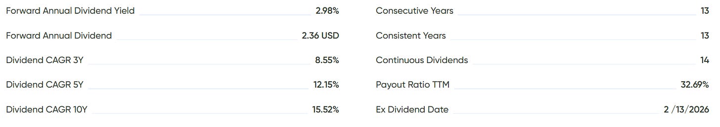 The dividend history is also reasonable in context. The company has been paying dividends for 13 years and has increased them every single year since initiation — including again this year. For a company that only began paying dividends relatively recently, that consistency matters.