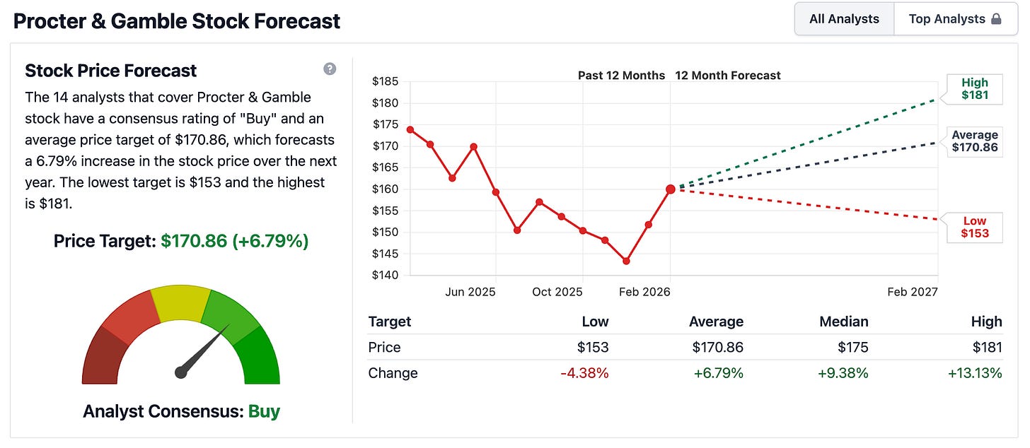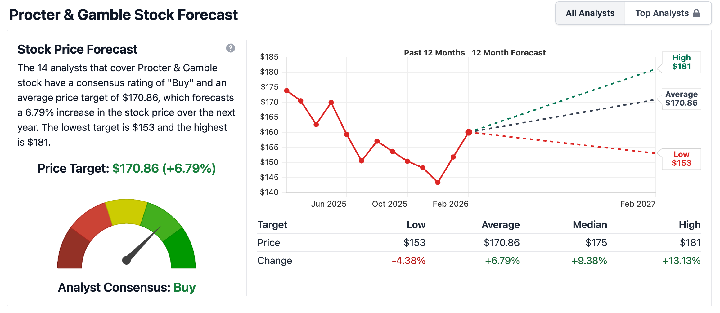 Based on the analyst consensus data, Procter & Gamble maintains a strong “Buy” rating, supported by a average 12-month price target of $170.86. This target suggests a potential upside of 6.79% from current levels.