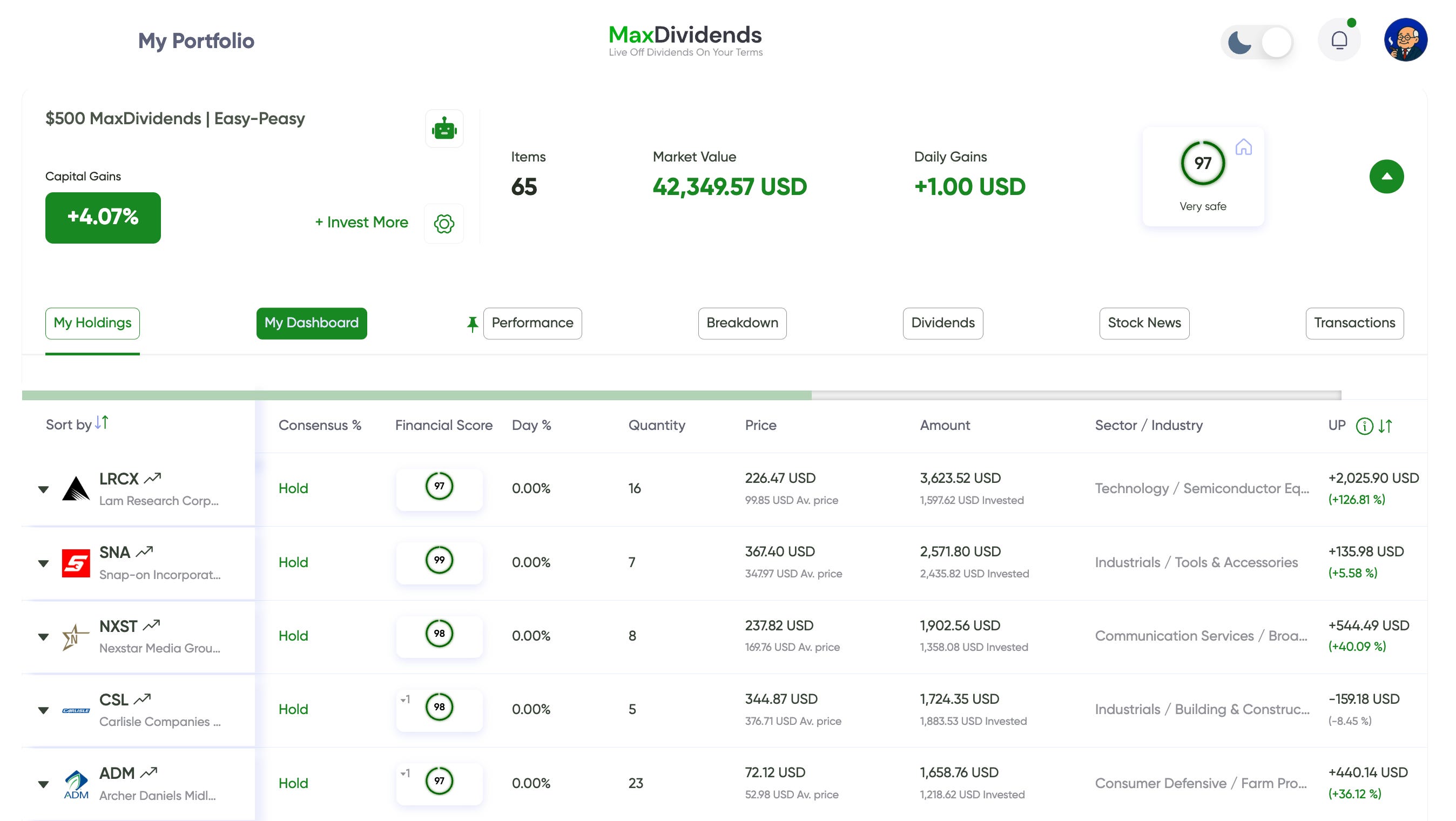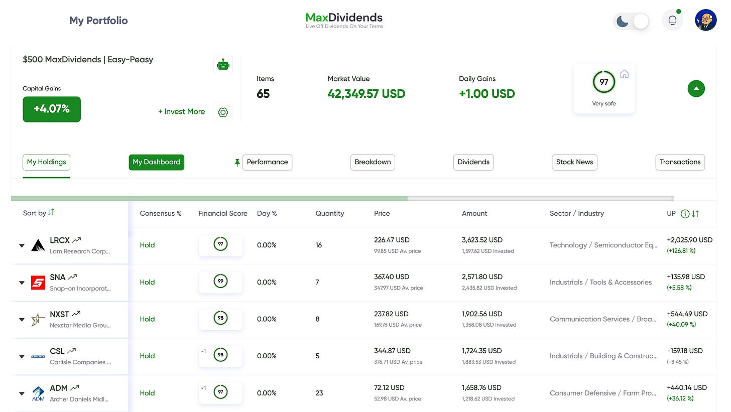 All charts, income forecasts, and progress metrics you see below are generated directly by the MaxDividends App.