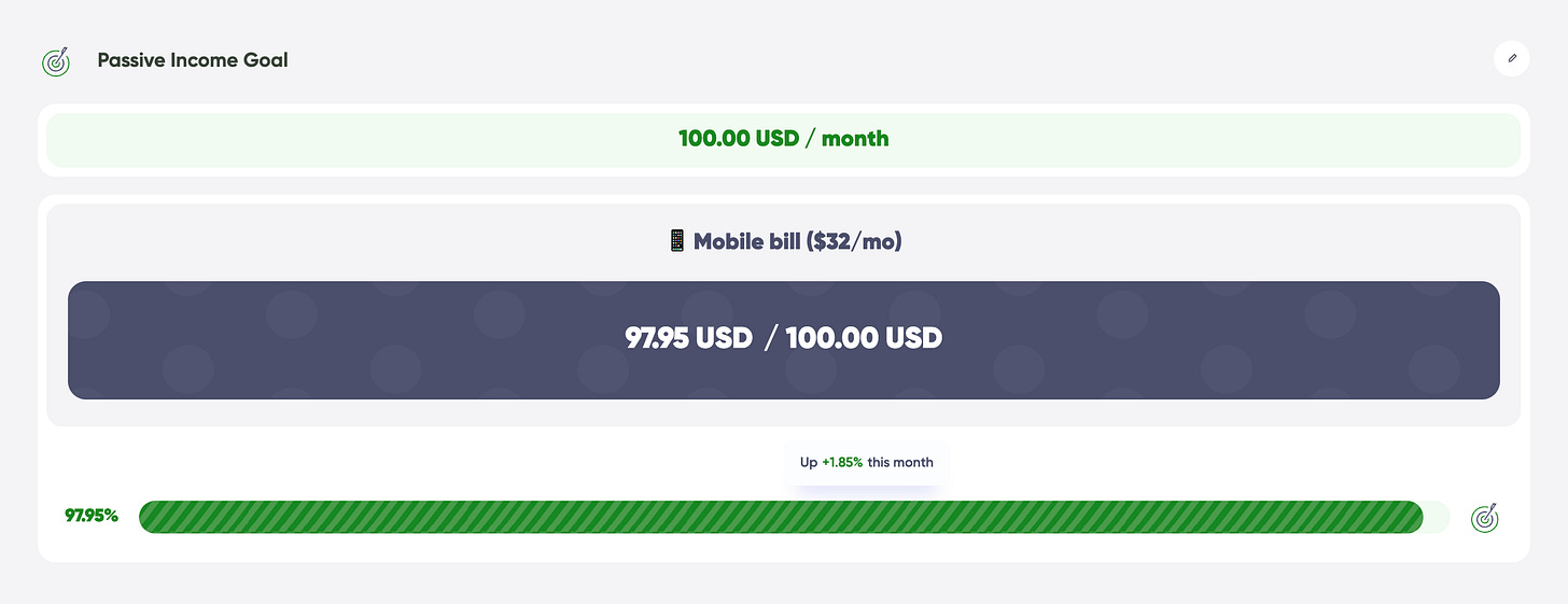 🎯 Mobile bill ($32/mo) – now 79.16% covered (up from 8.3% last week).