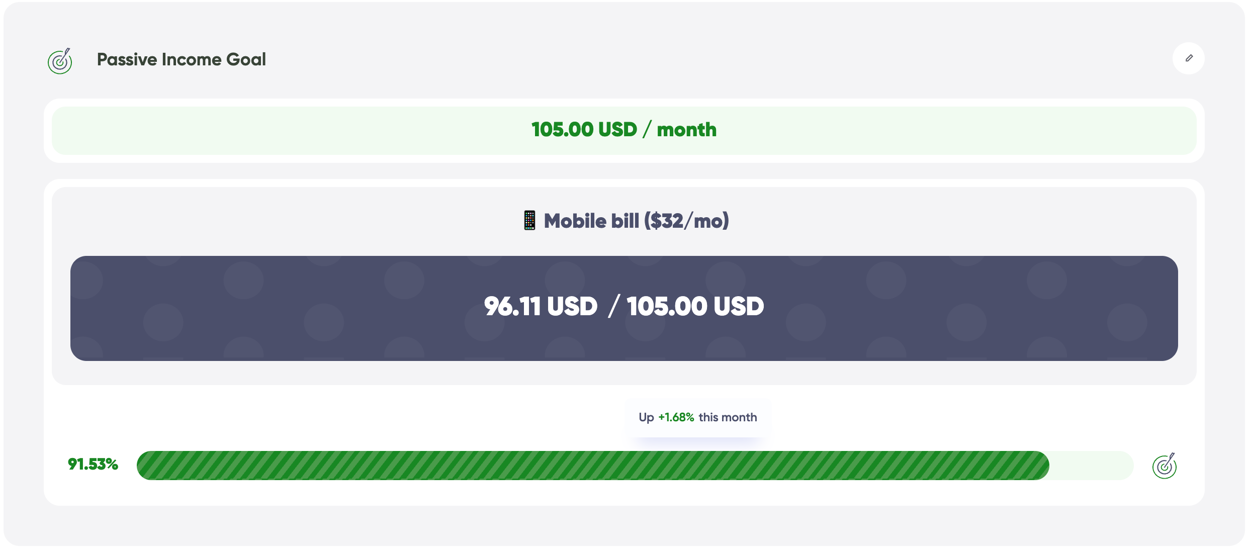 🎯 Mobile bill ($32/mo) – now 49.32% covered (up from 4.7% last week).