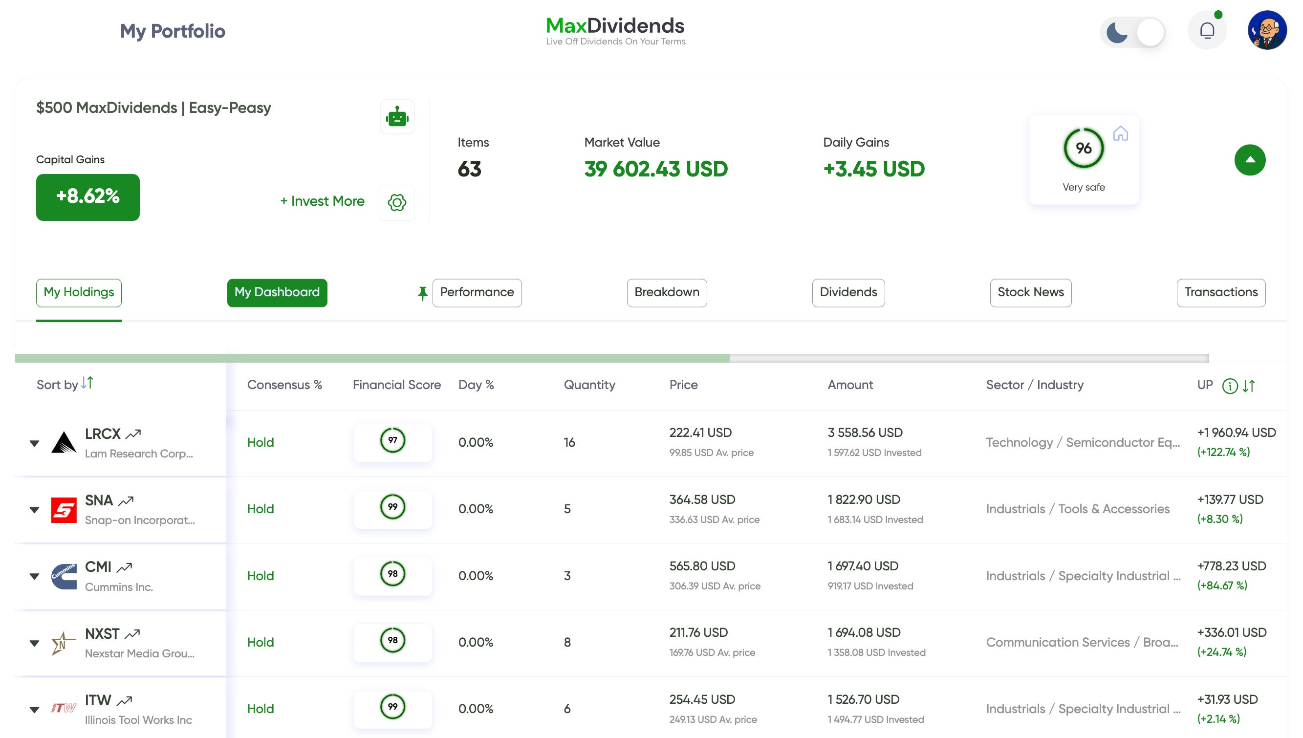 Below is a demo dividend portfolio, built and tracked inside the MaxDividends App.