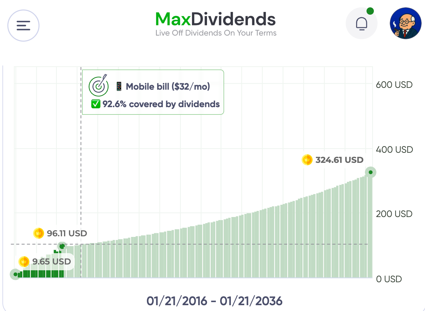 All charts, income forecasts, and progress metrics you see below are generated directly by the MaxDividends App.