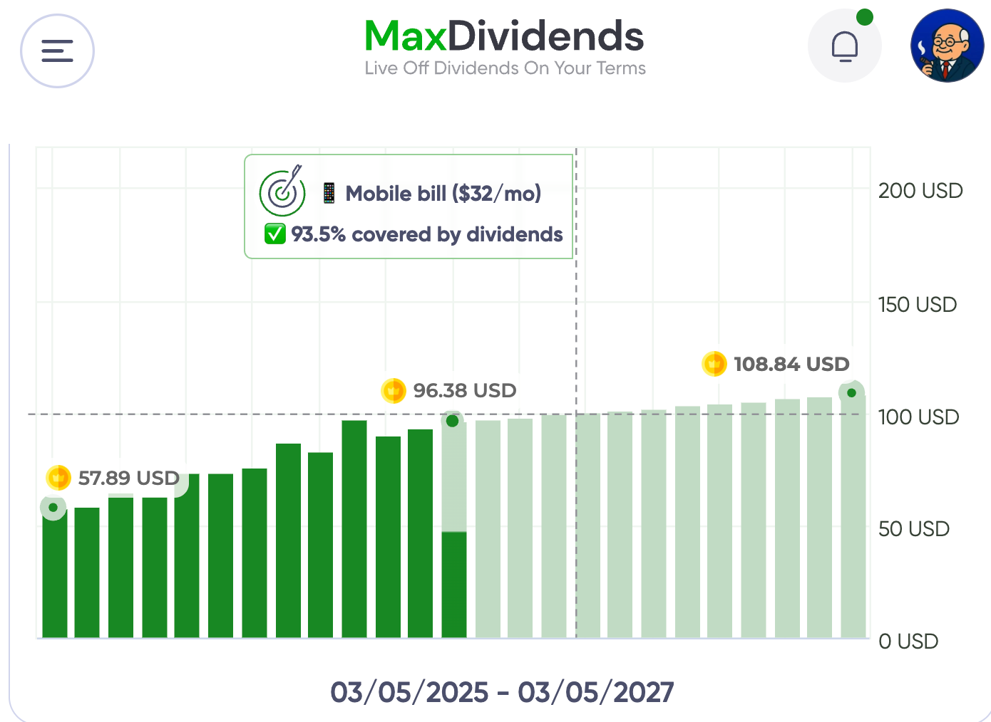 ✅ Push the next milestone. With the App, set your next “bill target” (utilities, car, or mortgage) and let dividends knock it out.