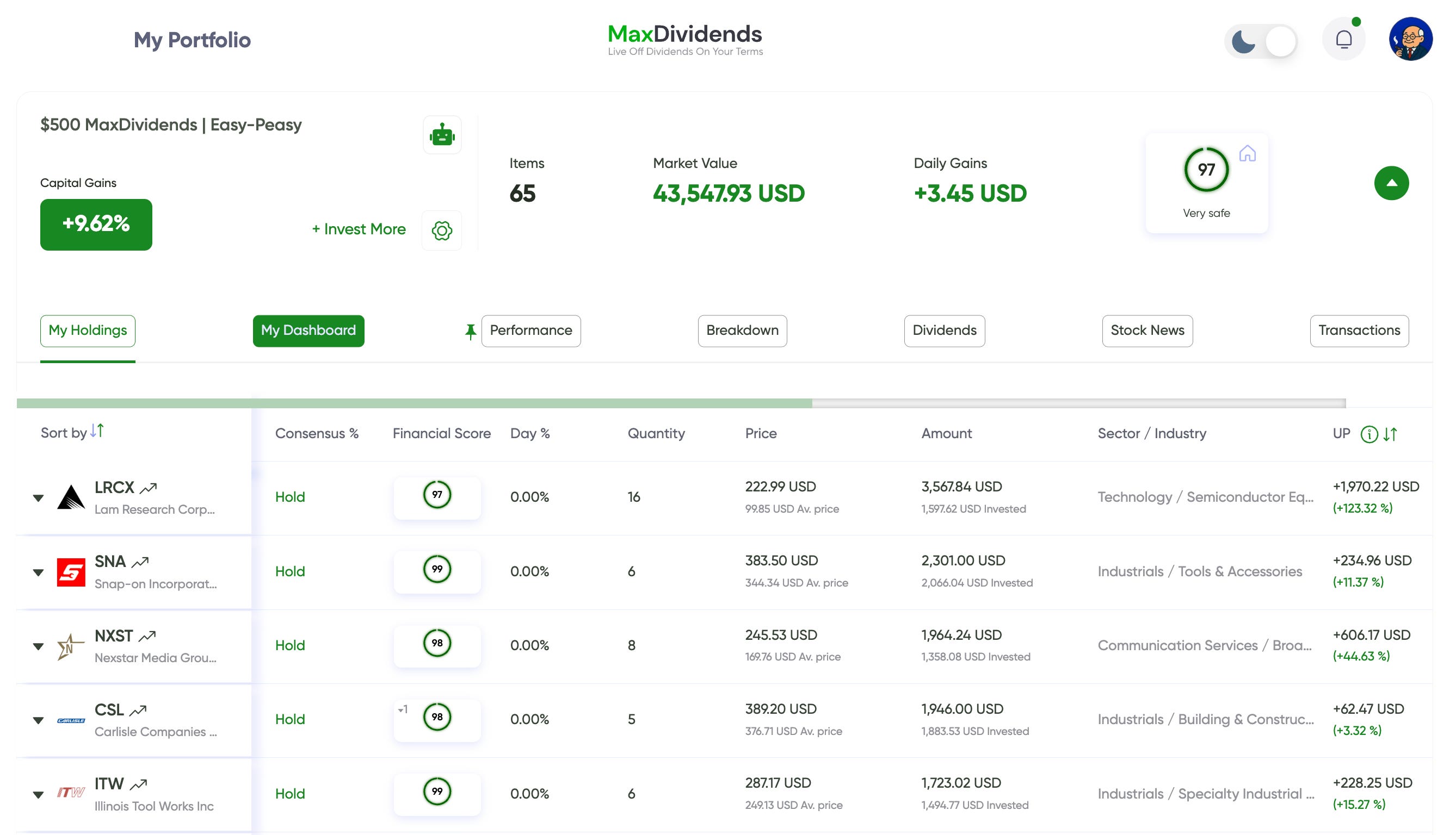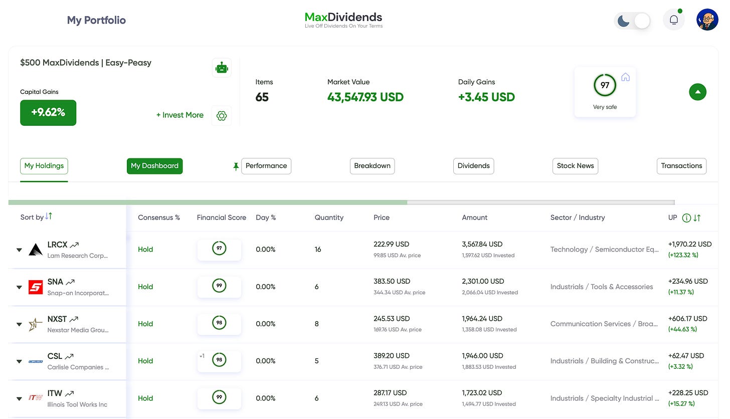 Below is a demo dividend portfolio, built and tracked inside the MaxDividends App.