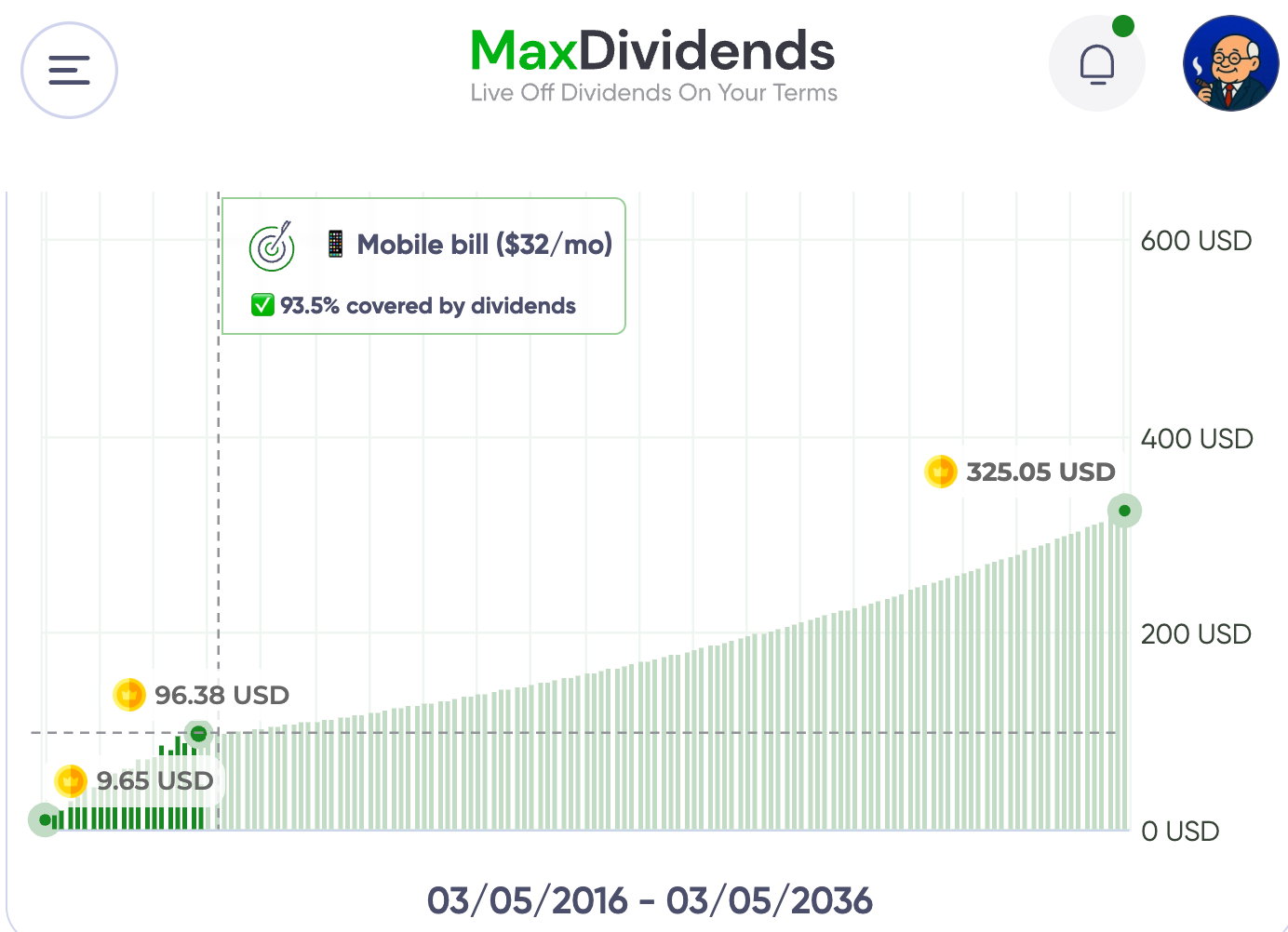 All charts, income forecasts, and progress metrics you see below are generated directly by the MaxDividends App.