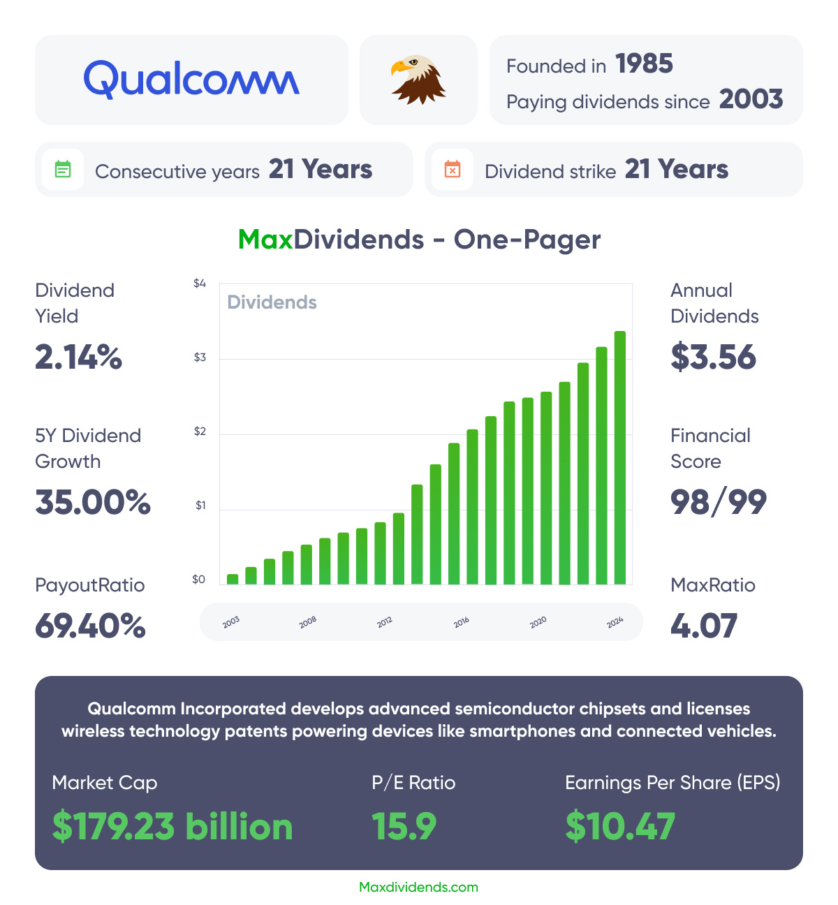 Qualcomm pays a quarterly cash dividend — as of now, it’s $0.89 per share. That adds up to roughly $3.56 per share per year, giving a yield of around 2.05%.