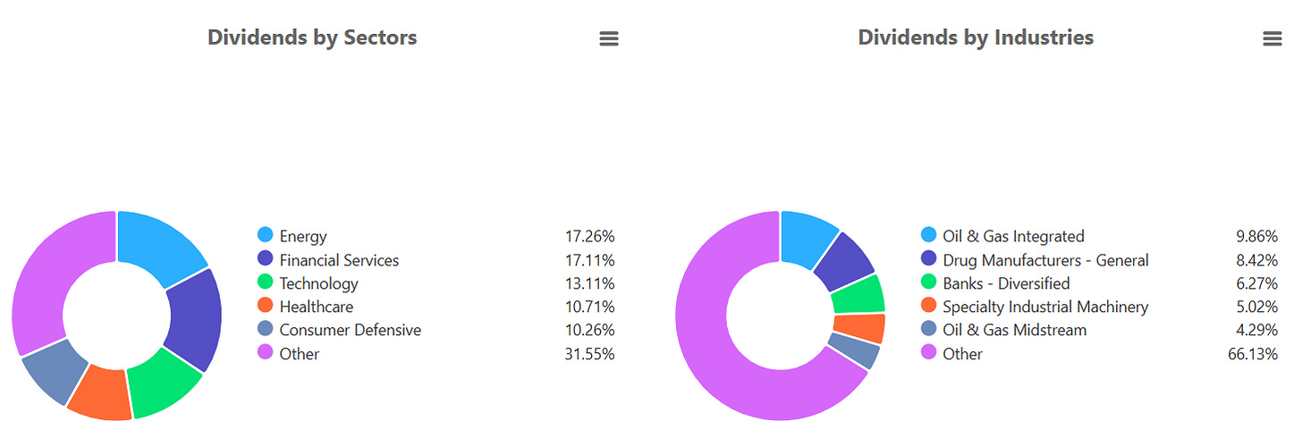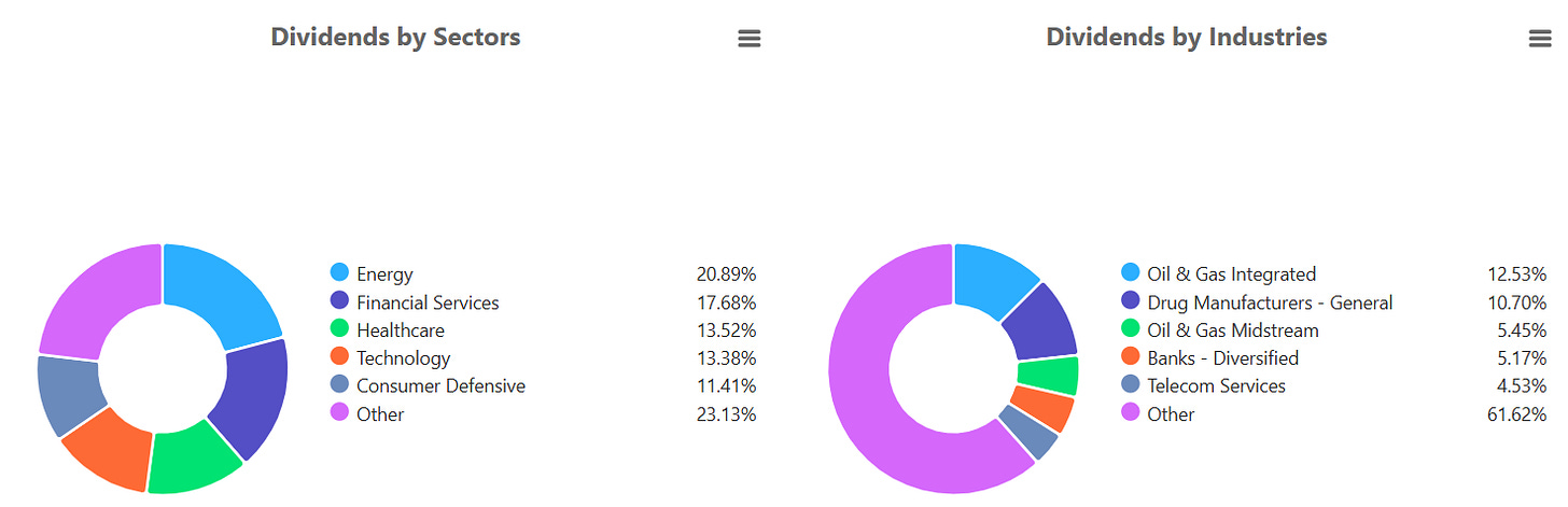 At the industry level, Integrated Oil & Gas now leads with 12.53% of total payouts. Drug Manufacturers contribute 10.70%, while Oil & Gas Midstream adds another 5.45%. Diversified Banks account for 5.17%, and Telecom Services represent 4.53%.