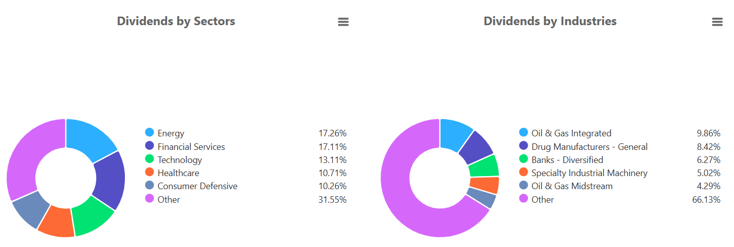 At the industry level, Oil & Gas Integrated companies represent the largest identifiable group at 9.86%. Drug Manufacturers contribute 8.42%, while Diversified Banks account for 6.27%. Specialty Industrial Machinery (5.02%) and Oil & Gas Midstream (4.29%) remain notable contributors. The sizable 66.13% “Other” segment underscores the wide spectrum of industries participating in global dividend generation.