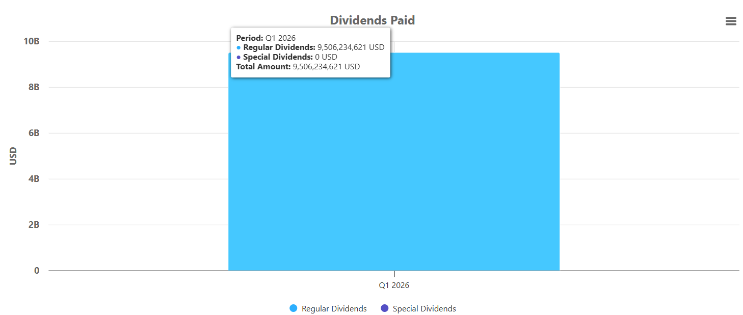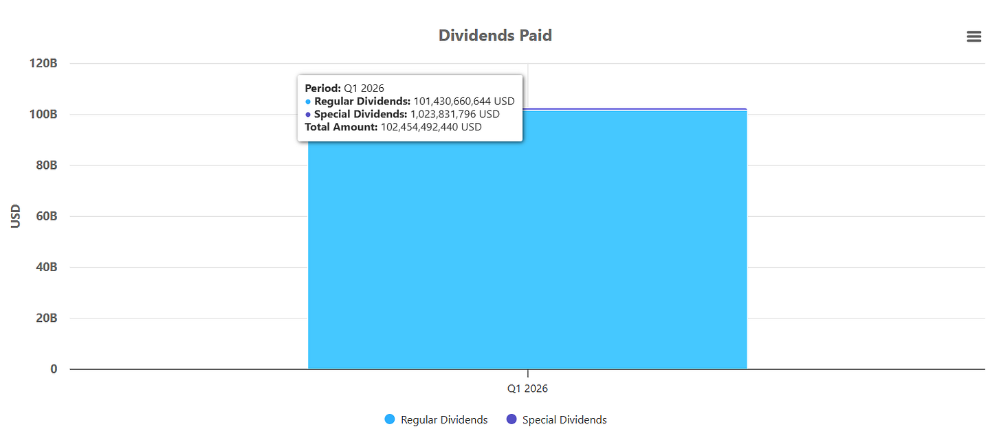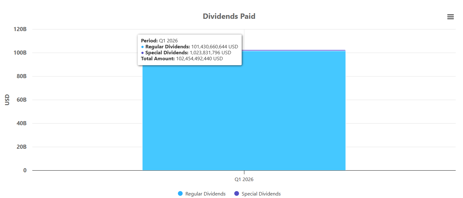 So far in Q1 2026, total cumulative dividends paid amount to approximately $102.45 billion. Of that total, $101.43 billion represents regular dividends, while $1.02 billion comes from special dividends.