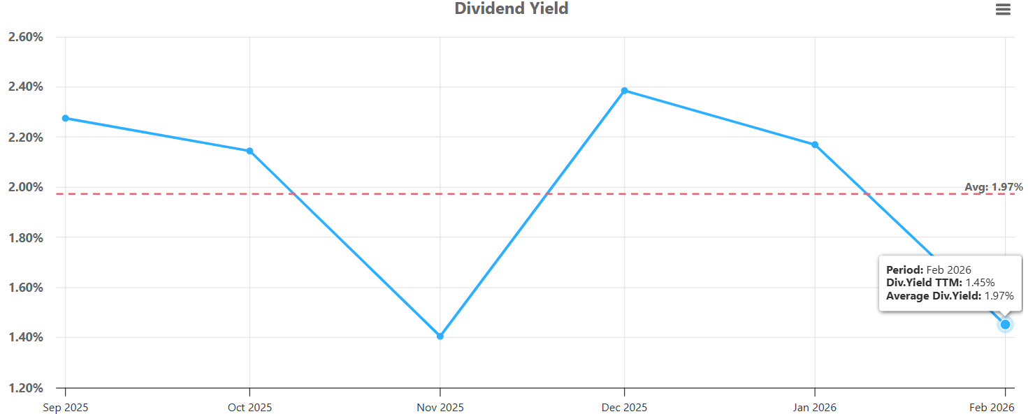 As of February 2026, the average dividend yield has declined to 1.45%, well below the long-term average of 1.97%.