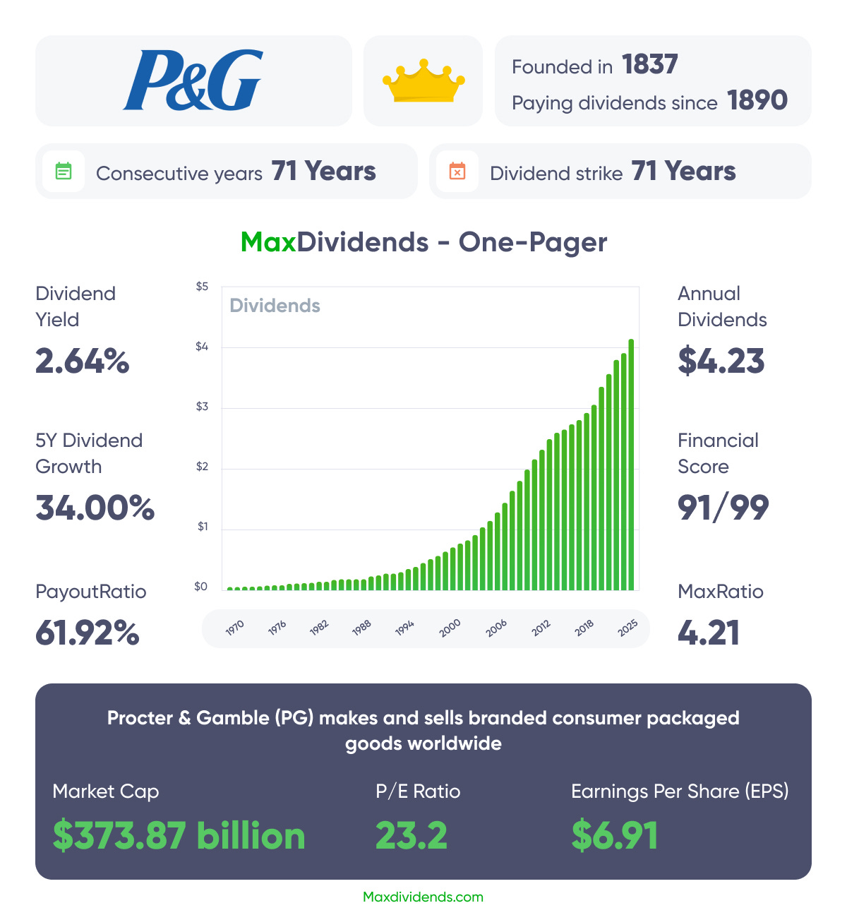 One of the defining features of Procter & Gamble’s shareholder proposition is its unusually long and uninterrupted dividend record. Since its incorporation in 1890, P&G has paid a cash dividend every single year for 135 consecutive years, making it one of the longest streaks in corporate history.