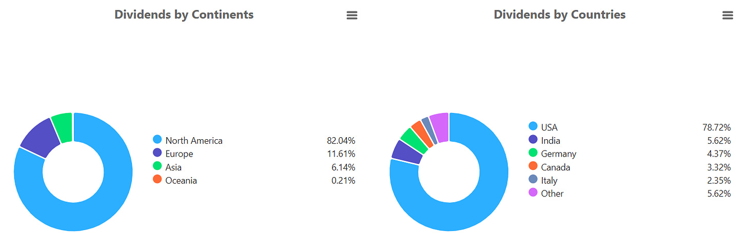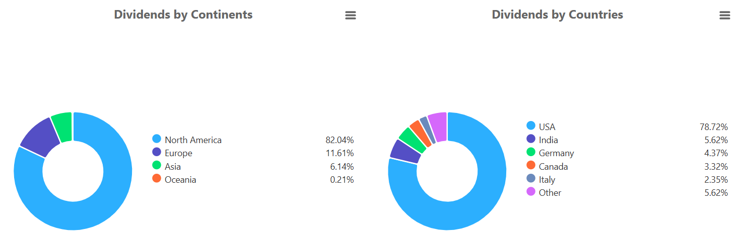 By country, the United States represents 78.72% of total dividend payments so far in Q1 2026. India (5.62%) and Germany (4.37%) follow, while Canada (3.32%) and Italy (2.35%) contribute smaller but still meaningful shares. The remaining 5.62% is distributed across other countries.