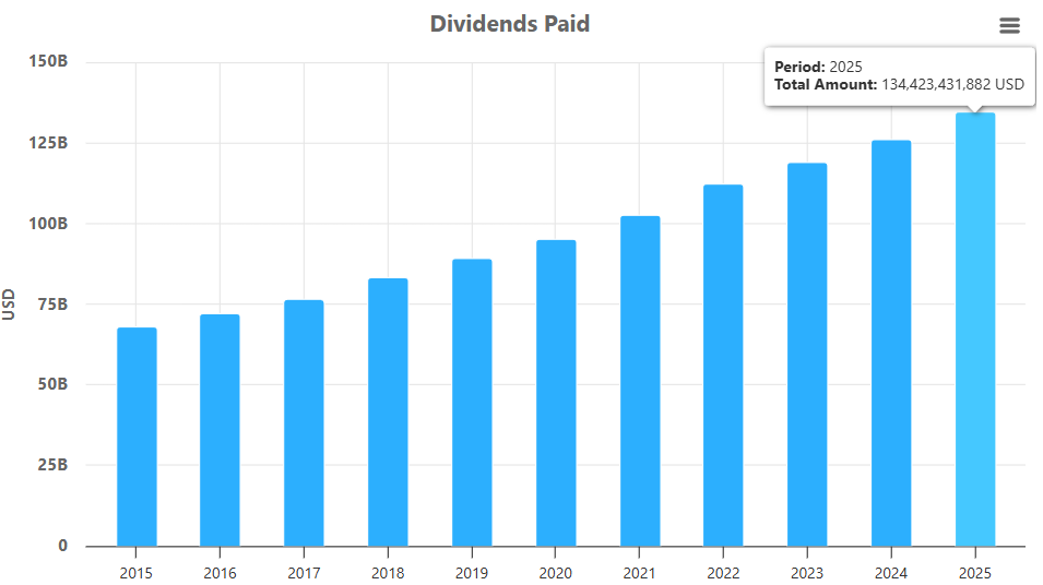 Annual dividend payouts grew from approximately $68 billion in 2015 to $134.4 billion in 2025, representing nearly a 100% increase over the period. This growth reflects not only rising earnings but also a consistent commitment by these companies to return cash through regular dividend increases across multiple economic cycles.