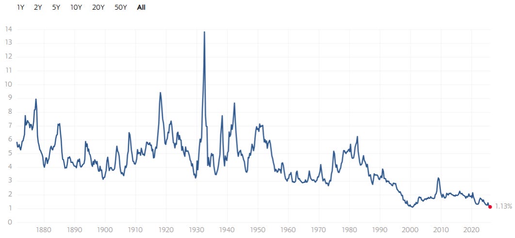 When viewed against nearly 150 years of data, today’s yield stands far below the long-term historical norm of 3–5%.