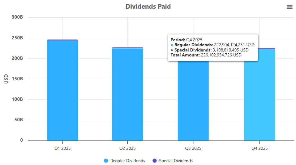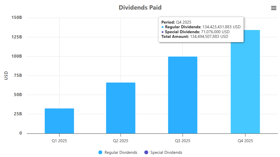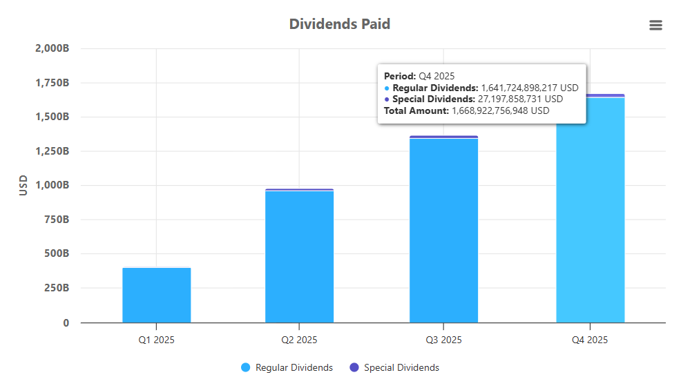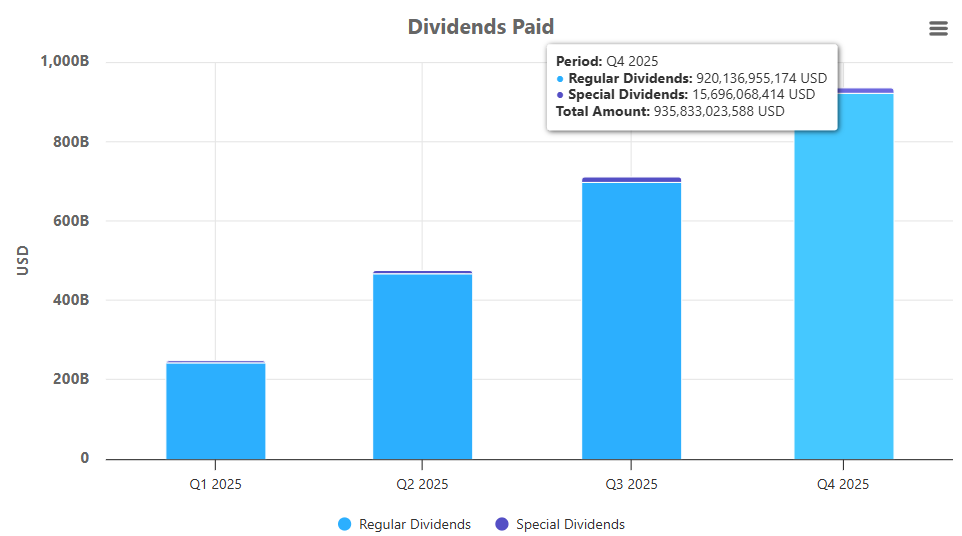 Cumulative payouts reached approximately $240B by Q1, increased to around $470B by Q2, and surpassed $700B by Q3. With Q4 2025 now fully reported, total dividends for the year reached $935.8 billion, consisting of $920.1 billion in regular dividends and $15.7 billion in special dividends.