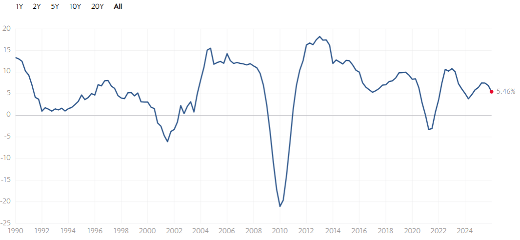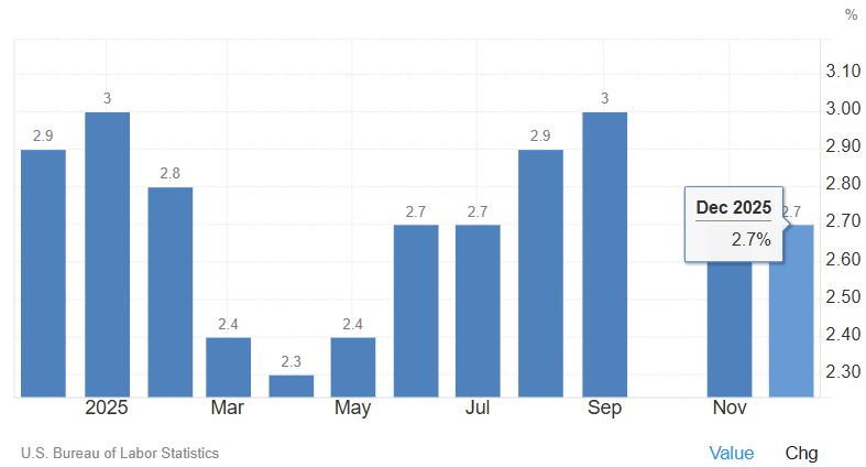 After easing to a low of approximately 2.3% in March, inflation gradually moved higher through mid-year, rising to around 2.7% in July and 2.9% in August, before reaching 3.0% in September. Following that peak, inflation moderated again, falling back to approximately 2.7% by December 2025.