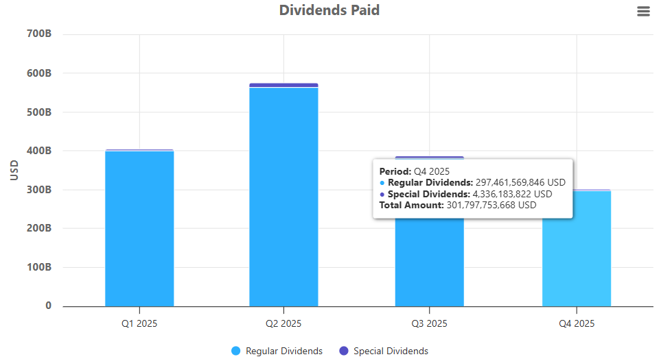 Overall, the quarterly pattern for 2025 indicates a stable and sustainable level of dividend payments, with regular dividends forming the core of shareholder returns as U.S. companies entered 2026.